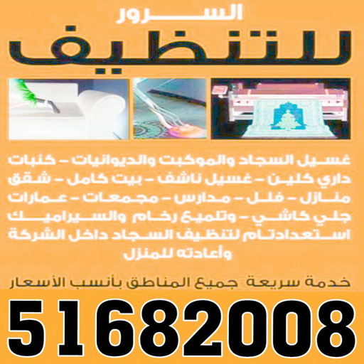 لدينا خبرة بعملية التنظيف وغسيل السجاد والنوافذ وأيضا الستائر والسجاد والكنب ونمتلك مكائن متطورة بأيدي عمال متخصصة وتنظيف الأرضيات من الصبغ والإسمنت، كما إننا نقوم بغسيل وتعطير السجاد وتنظيف المنازل بعقود تنظيف سنوية أو شهرية للمحافظة على نظافة المنازل دائما ولكسب ثقة عملائنا بنا وتقديم خدماتنا بأرخص الأسعار.